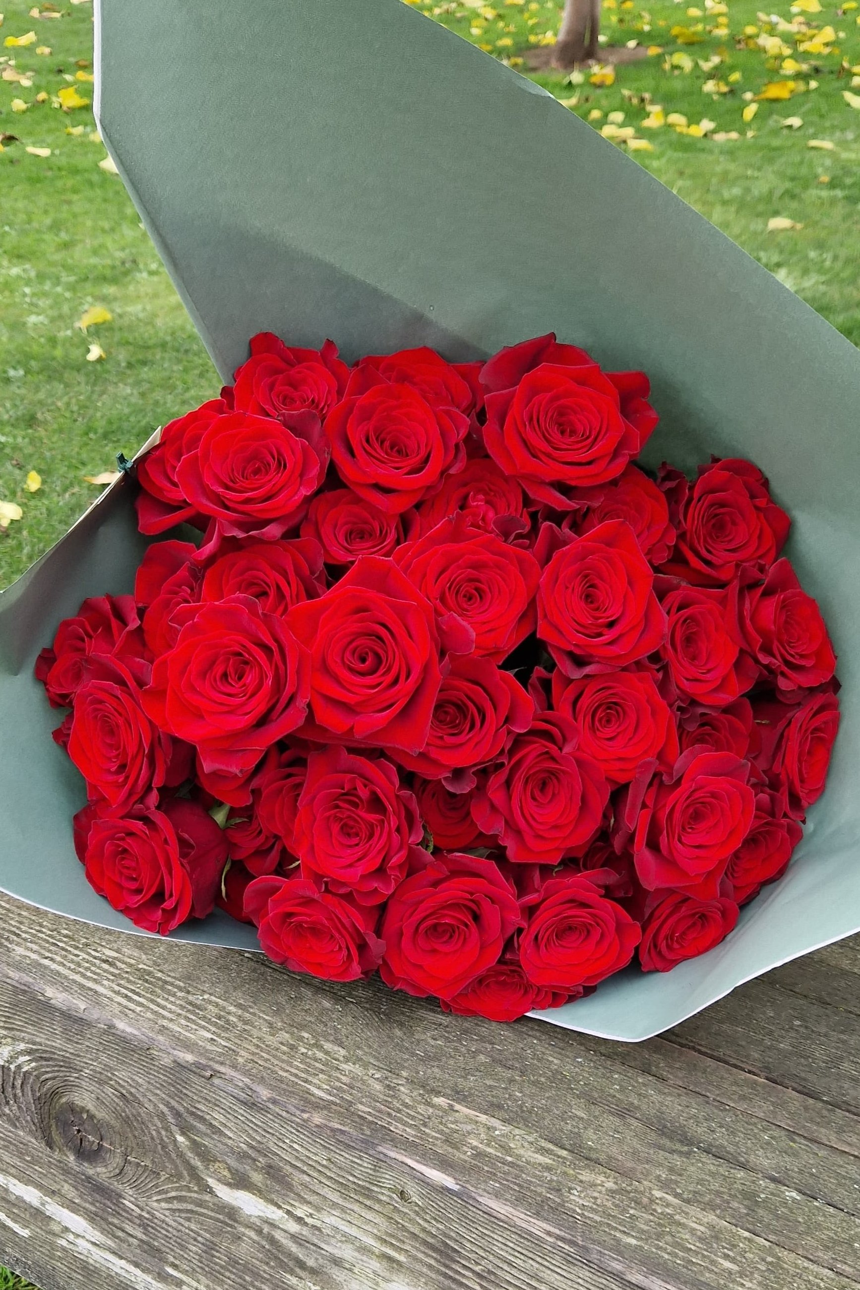 Ramo con rosas rojas y flores de temporada con envoltorio en papel kraft.